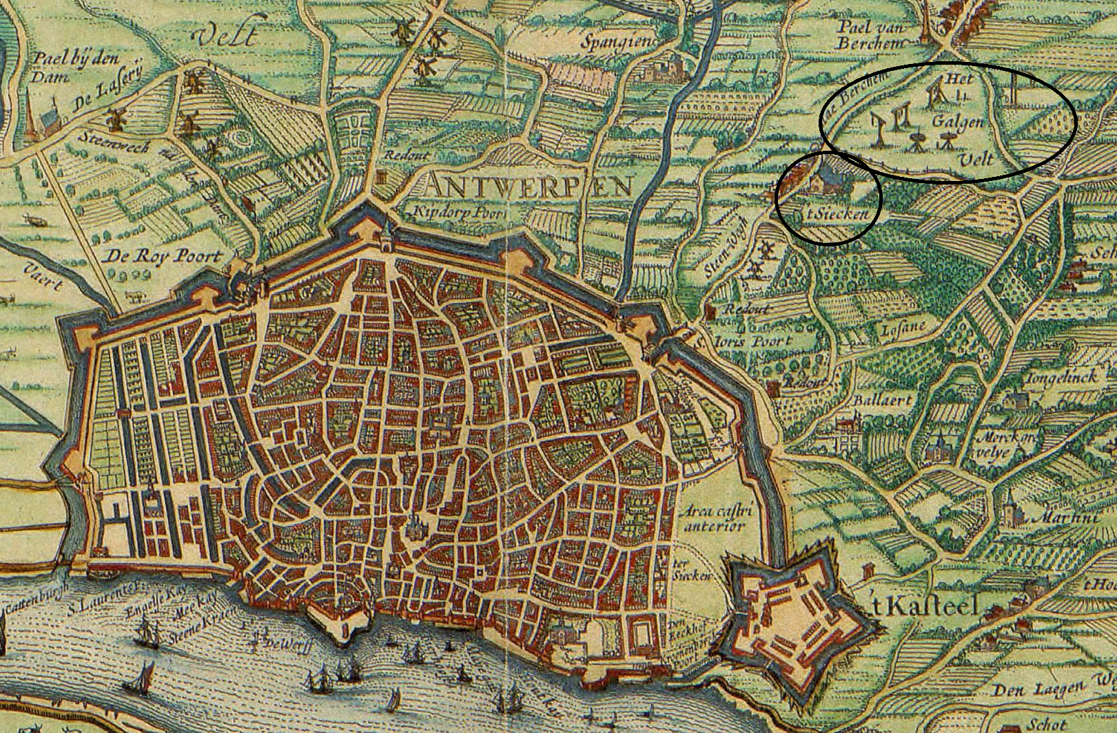 De Antwerpse leprozerie (’t Siecken) gelegen naast het Galgenveld op een kaart van Claes Janszoon Visscher (1624). Foto: Wikimedia.